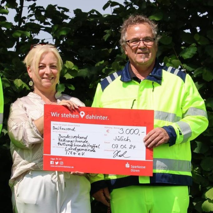 Am 7. Juni 2024 übergab Frau Petra Heutz einen Scheck in Höhe von 3.000 € aus der Lotterie "PS-Sparen" an den Vorsitzenden der Rettungshundestaffel Landgemeinde Titz e. V., Herrn Heinz Herper. Hocherfreut über diese schöne Summe bedankte er sich bei der Sparkasse Düren, die damit die Verbundenheit zur Region und der sehr wichtigen Arbeit, die in der Hundestaffel geleistet wird, zum Ausdruck bringt.